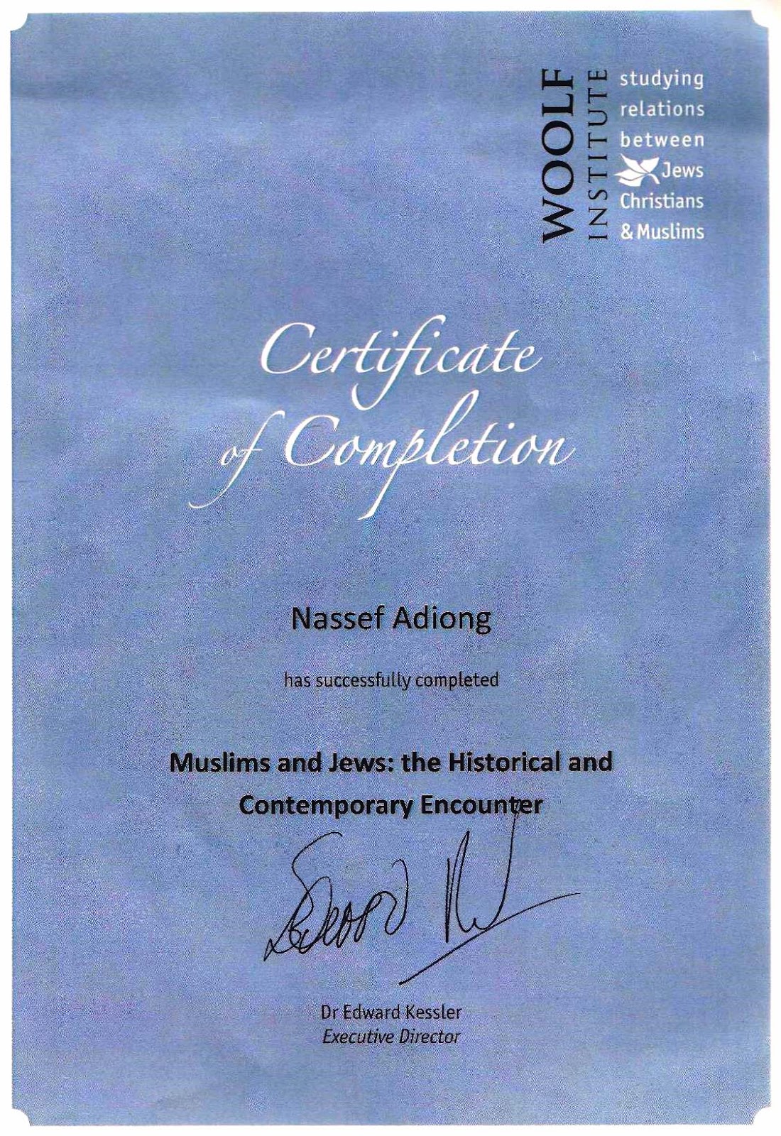 I am so glad that I participated and learned so much about the historical and contemporary relations between the Jews and Muslims. I am thankful to the WOOLF Institute for giving me a full bursary, without it I won’t be able to experience a modern methodology of learning and acquisition of knowledge regarding the subject-matter even am residing outside the UK. I wish to acknowledge my debt of gratitude to Dr. Kessler, Dr. Meri, Shayk Mumisa, Dr. Dominguez-Diaz, Dr. Rosmer, Mrs. Kessler, Dr. Cohen and to my fellow colleagues for their shared wisdom and intellect during the forum discussions and debates.
