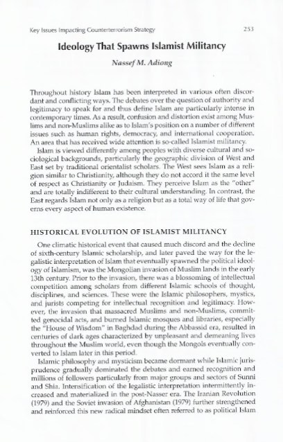 - Nassef Manabilang Adiong, Ideology that Spawns Islamist Militancy, (in Frank Shanty (Ed.), Key Issues Impacting Counterterrorism Strategy, Vol. 1: Combating Modern Terrorism (1968-2011), pp. 253-258, Santa Barbara, CA: ABC-CLIO).