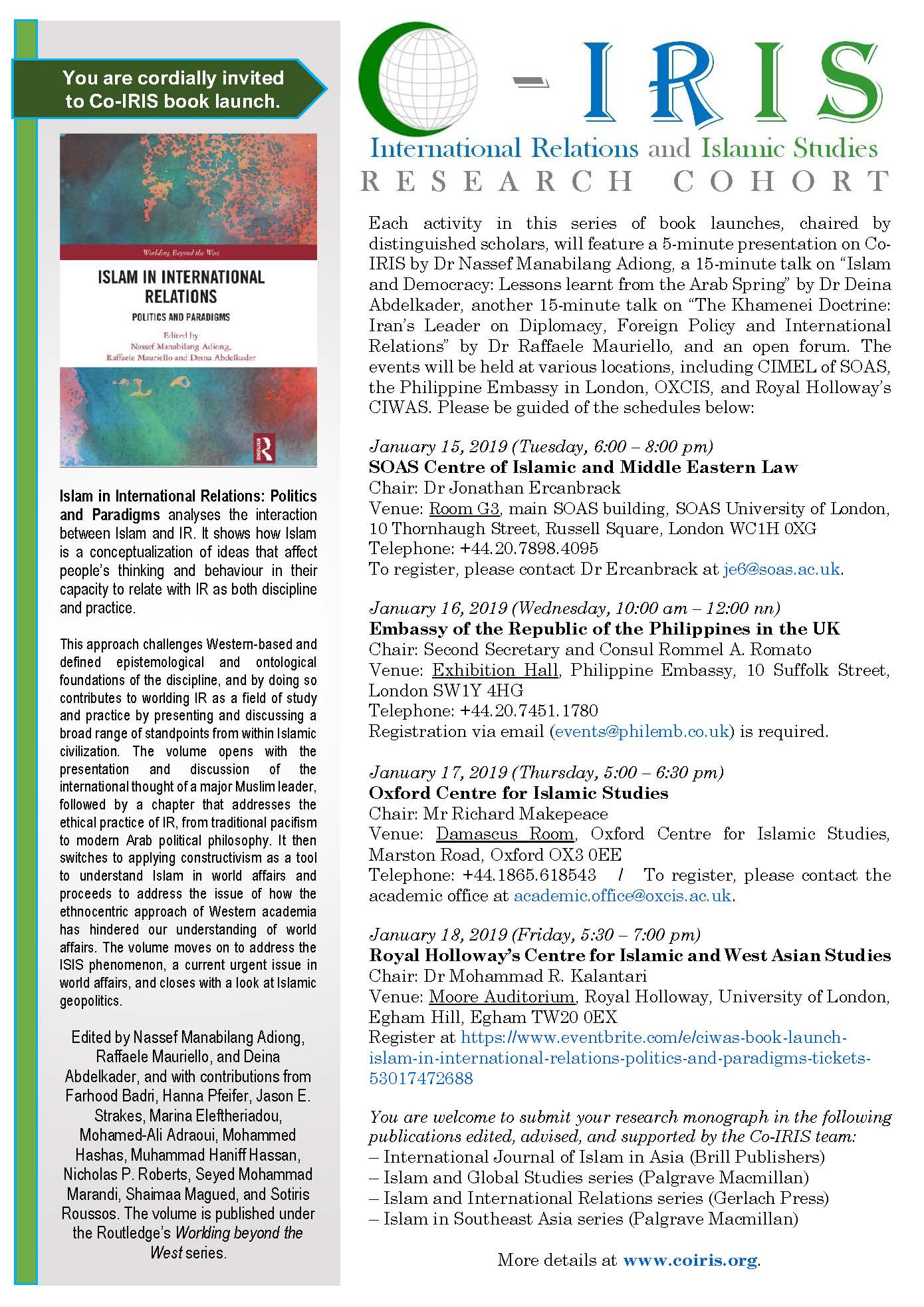 Each activity in this series of book launches, chaired by distinguished scholars, will feature a 5-minute presentation on Co-IRIS by Dr Nassef Manabilang Adiong, a 15-minute talk on “Islam and Democracy: Lessons learnt from the Arab Spring” by Dr Deina Abdelkader, another 15-minute talk on “The Khamenei Doctrine: Iran’s Leader on Diplomacy, Foreign Policy and International Relations” by Dr Raffaele Mauriello, and an open forum. The events will be held at various locations, including CIMEL of SOAS, the Philippine Embassy in London, OXCIS, and Royal Holloway’s CIWAS. Please be guided of the schedules below: