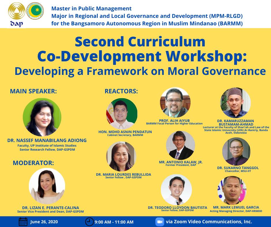 DAP-GSPDM in partnership with DAP sa Mindanao (DsM) conducted today, June 26, 2020, the Second Curriculum Co-Development Workshop for the Master in Public Management Major in Regional and Local Governance and Development (MPM-RLGD) for the Bangsamoro Autonomous Region of Muslim Mindanao (BARMM).