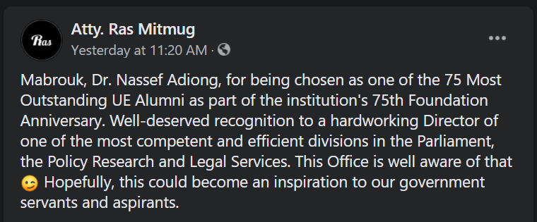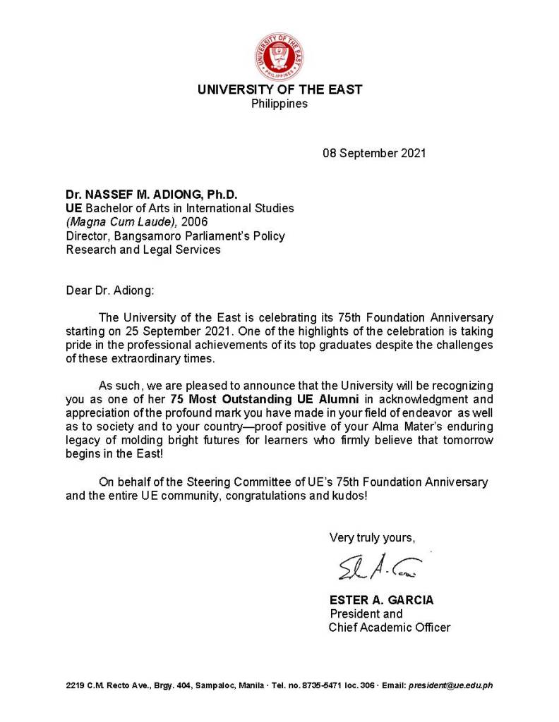 With more than 50 academic publications in various platforms, 25 academic grants, 18 awards (UP Centennial Professorial Chair, PUP Professorial Chair, TOYM, among others), 14 scholarships, 6 fellowships, 6 consultancies, and numerous researches, the stellar career of Dr Nassef Manabilang Adiong—whose at his mid-30s presently—is truly an inspiration. After 15 years from obtaining his Bachelor of Arts in International Studies (Magna cum Laude) in 2006, he is being honored this year as one of the Most Outstanding Alumni in the 75th foundation anniversary of the University of the East. Shepherding towards reforms in the political economy of world’s knowledge systems conveniently lenient to Western canons, he founded three research organizations, five book series, and one scholarly journal to provide impetus to marginalized plurality of intellectual voices. His recognition extends beyond the Philippine soil as he was elected as governing board officer at the World International Studies Committee in 2020 and Asia representative at the ISA Global South Caucus in 2018. To find and connect to his ancestral roots by serving his own community, the Bangsamoro people, he has taken a new role as the tenured Director of the Bangsamoro Parliament’s Policy Research and Legal Services.