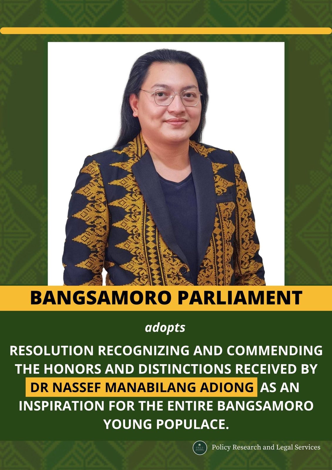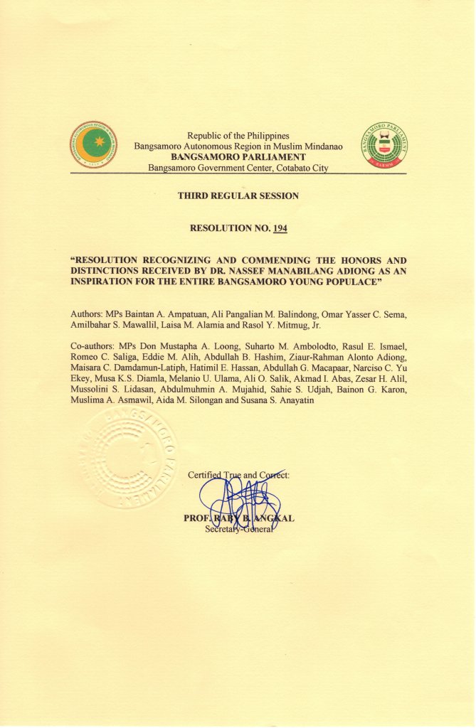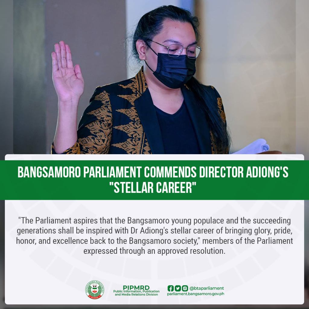 COTABATO CITY – “The Parliament aspires that the Bangsamoro young populace and the succeeding generations shall be inspired with Dr Adiong’s stellar career of bringing glory, pride, honor, and excellence back to the Bangsamoro society,” members of the Parliament expressed through an approved resolution.