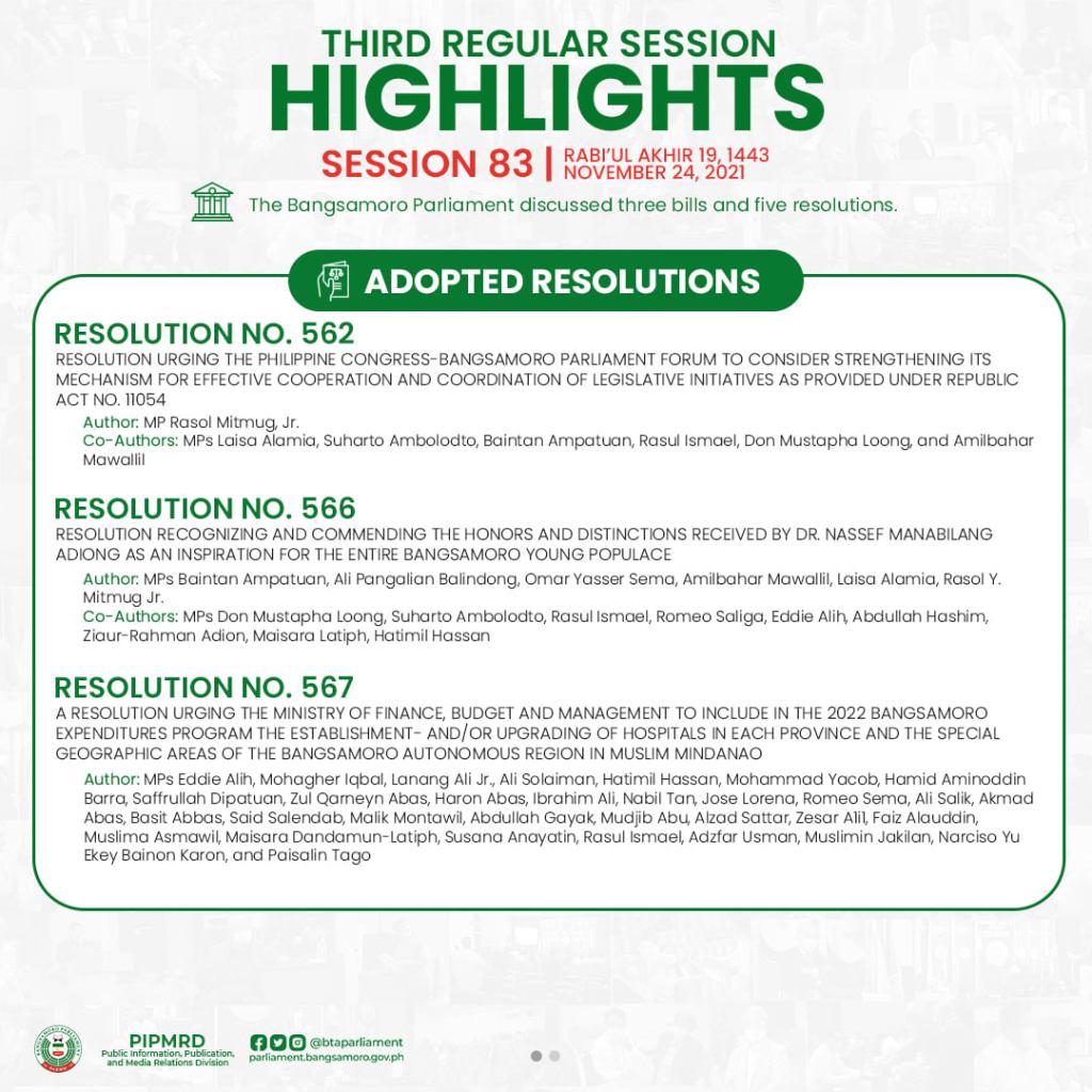 It was co-authored by MPs Engr. Don Mustapha Loong, Atty. Suharto Ambolodto, Rasul Ismael, Romeo Saliga, Eddie Alih, Abdullah Hashim, Ziaur-Rahman Adiong, Atty. Maisara Damdamun-Latiph, and Hatimil Hassan. (Policy Research and Legal Services)