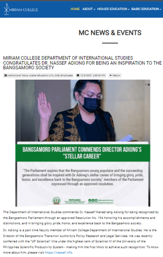 With more than 50 scholarly books, journal articles, edited volumes and other publications, Director Adiong, according to the MPs, has provided significant contributions to advance the research development of the Bangsamoro region.
