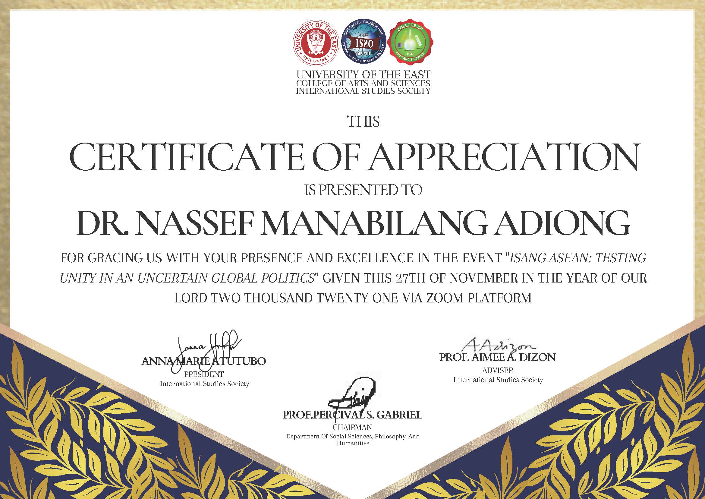Nassef is the founder of PHISO (Philippine International Studies Organization), BRLN (Bangsamoro Research and Legal Network), DSRN (Decolonial Studies Research Network), and Co-IRIS (International Relations and Islamic Studies Research Cohort). He researches policy issues affecting the Bangsamoro society and explores decolonial knowledge sources of the global south as well as interdisciplinary study between Islam and International Relations.