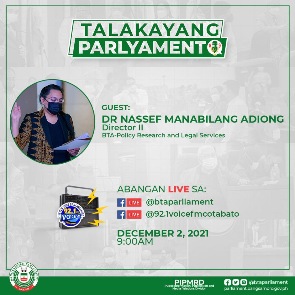 Fourth episode of Talakayang Parlyamento with our guest, BTA’s Policy Research and Legal Services Director, Dr. Nassef Manabilang Adiong