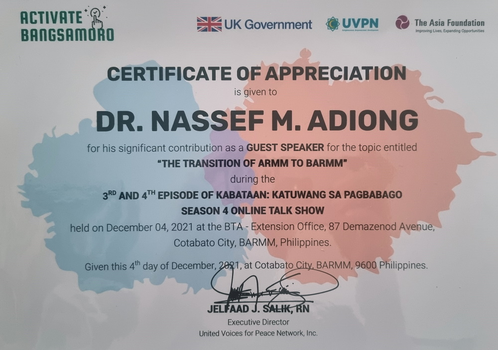 Nassef is the founder of Co-IRIS (International Relations and Islamic Studies Research Cohort), PHISO (Philippine International Studies Organization), DSRN (Decolonial Studies Research Network), and BRLN (Bangsamoro Research and Legal Network). He works on interdisciplinary research between Islam and International Relations and explores the Bangsamoro society as he heads the Policy Research and Legal Services (PRLS) of the Bangsamoro Parliament. Visit https://nassef.info/ for more details. View all posts by Nassef Manabilang Adiong
