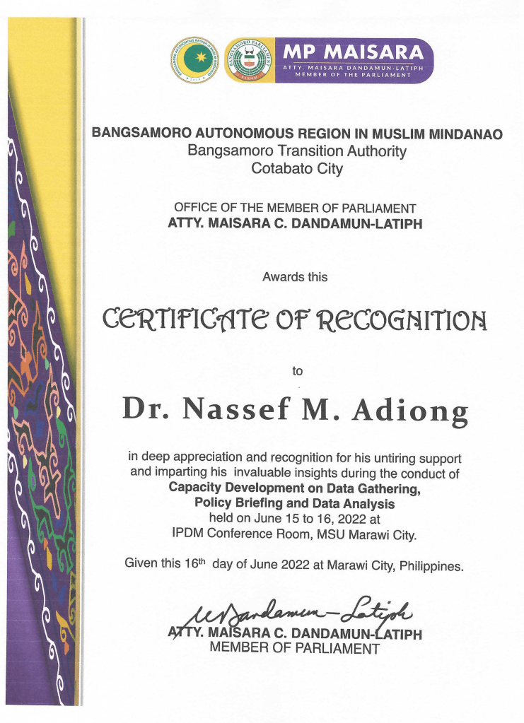 Capacity Development on Data Gathering, Policy Briefing, and Data Analysis to the Staff of MP Atty. Maisara C. Dandamun-Latiph