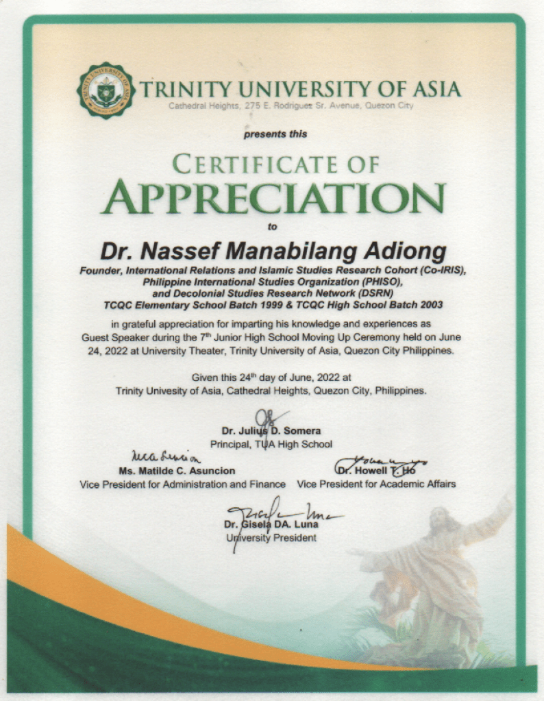 Nassef is the founder of Co-IRIS (International Relations and Islamic Studies Research Cohort), PHISO (Philippine International Studies Organization), DSRN (Decolonial Studies Research Network), and BRLN (Bangsamoro Research and Legal Network). He works on interdisciplinary research between Islam and International Relations and explores the Bangsamoro society as he heads the Policy Research and Legal Services (PRLS) of the Bangsamoro Parliament. Visit https://nassef.info/ for more details. View all posts by Nassef Manabilang Adiong