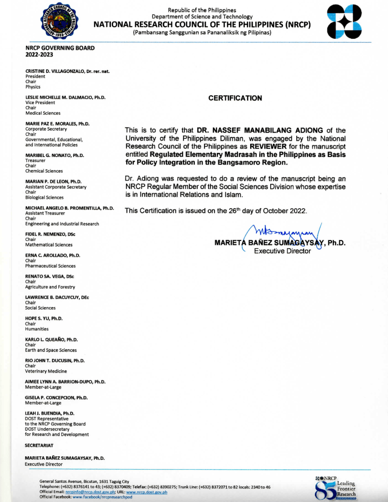 Good day and greetings from the National Research Council of the Philippines (NRCP).