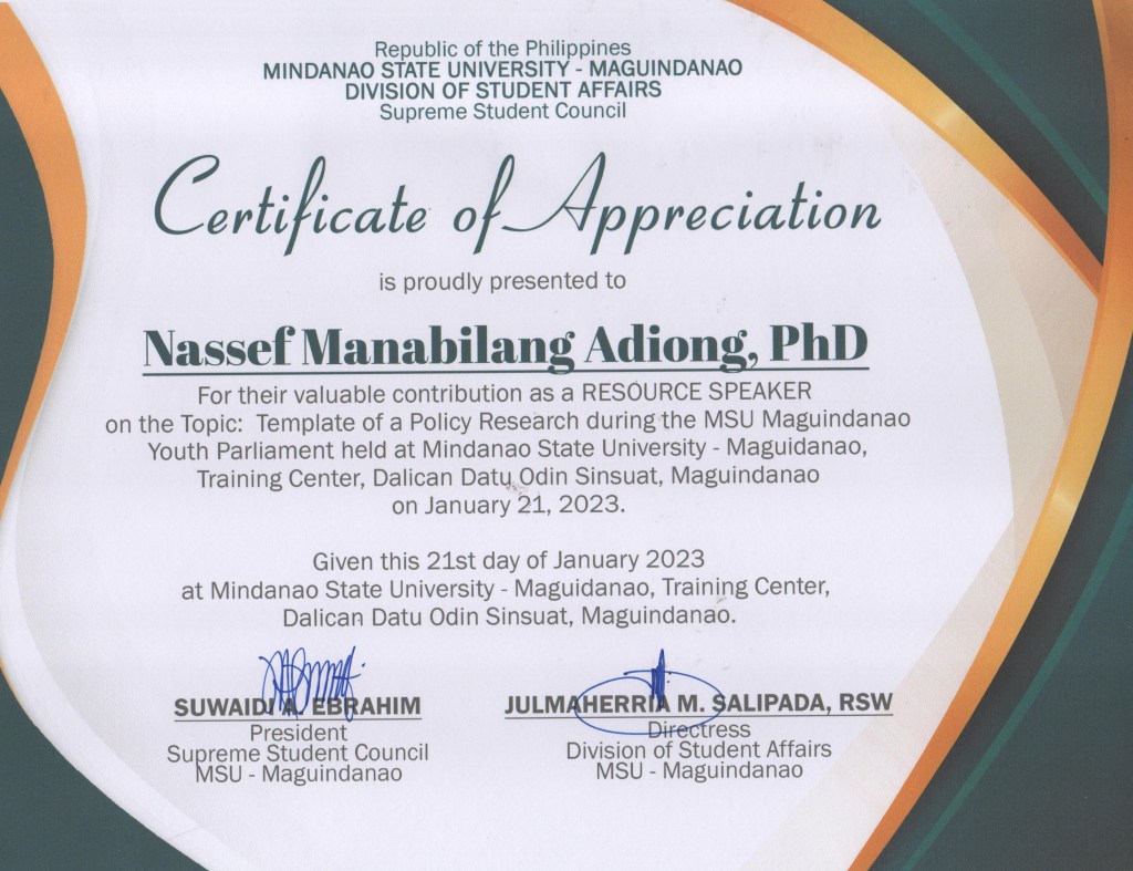 Nassef is the founder of Co-IRIS (International Relations and Islamic Studies Research Cohort), PHISO (Philippine International Studies Organization), DSRN (Decolonial Studies Research Network), and BRLN (Bangsamoro Research and Legal Network). He works on interdisciplinary research between Islam and International Relations and explores the Bangsamoro society as he heads the Policy Research and Legal Services (PRLS) of the Bangsamoro Parliament. Visit https://nassef.info/ for more details. View all posts by Nassef Manabilang Adiong