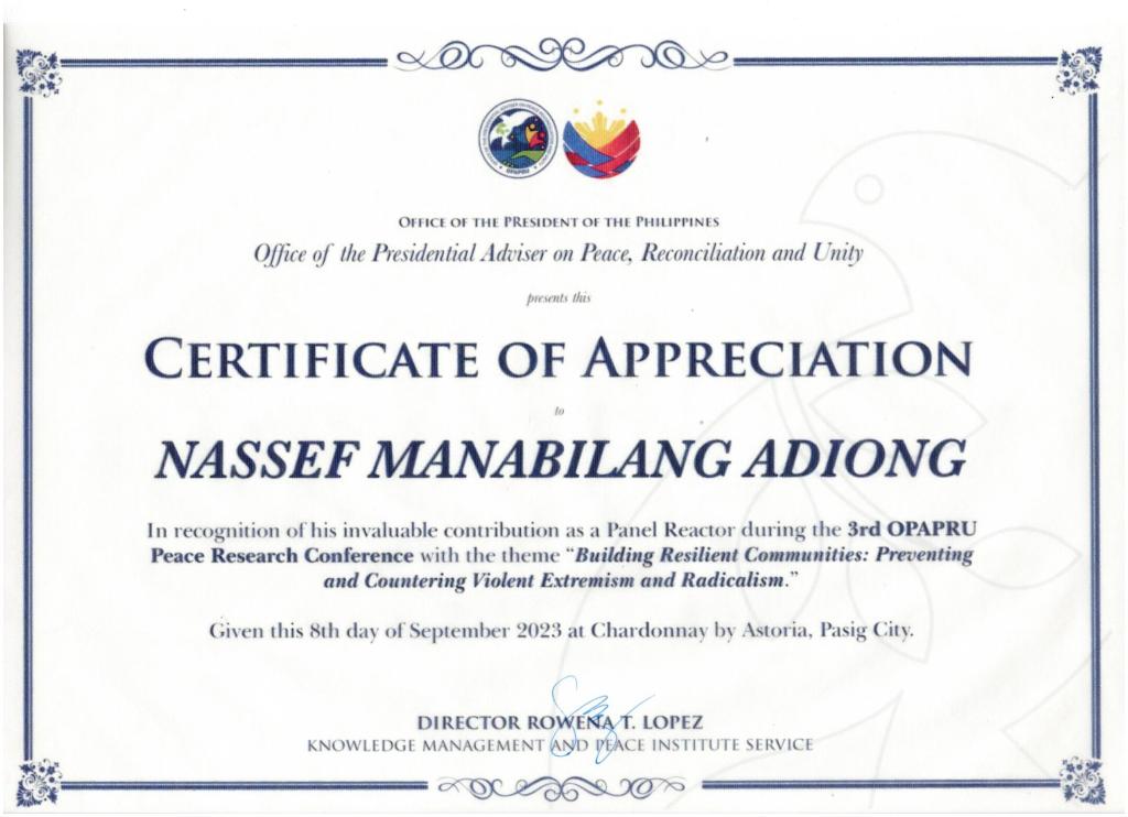 Nassef is the founder of PHISO (Philippine International Studies Organization), BRLN (Bangsamoro Research and Legal Network), DSRN (Decolonial Studies Research Network), and Co-IRIS (International Relations and Islamic Studies Research Cohort). He researches policy issues affecting the Bangsamoro society and explores decolonial knowledge sources of the global south as well as interdisciplinary study between Islam and International Relations.