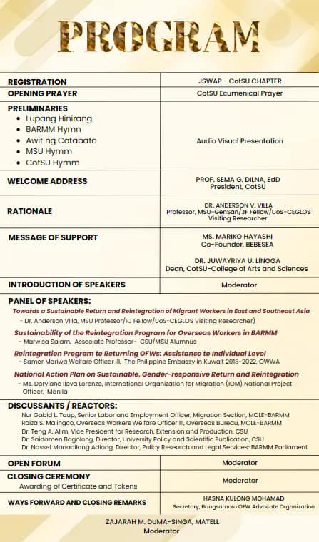 Nassef is the founder of PHISO (Philippine International Studies Organization), BRLN (Bangsamoro Research and Legal Network), DSRN (Decolonial Studies Research Network), and Co-IRIS (International Relations and Islamic Studies Research Cohort). He researches policy issues affecting the Bangsamoro society and explores decolonial knowledge sources of the global south as well as interdisciplinary study between Islam and International Relations.