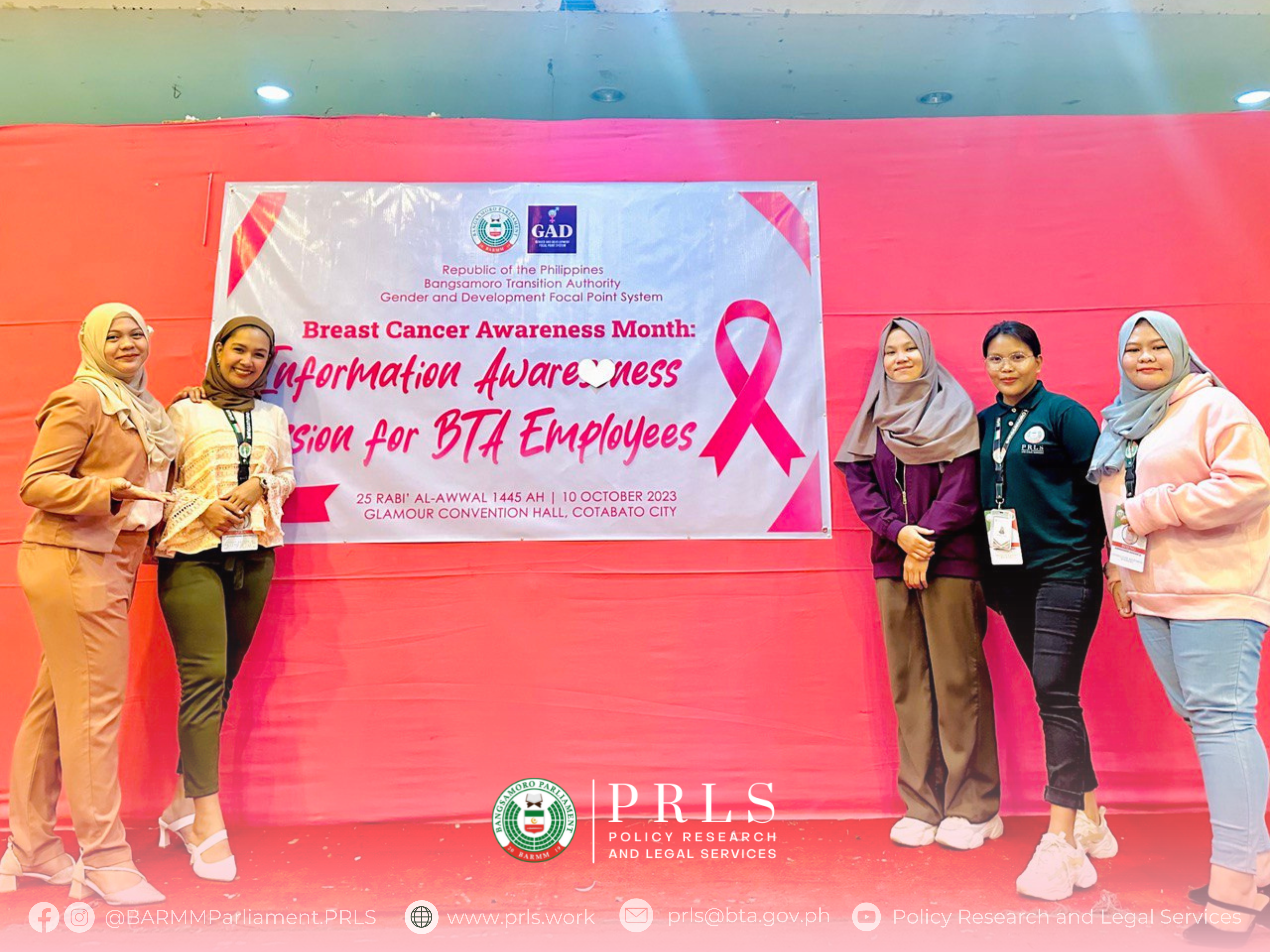 Bangsamoro’s Policy Research and Legal Services (PRLS) engages in efforts to promote awareness and encourage the adoption of health-conscious practices. We stand in solidarity and support for Breast Cancer Awareness Month through the initiatives of the BTA’s GAD Focal Point System in partnership with Cotabato Regional Medical Center.