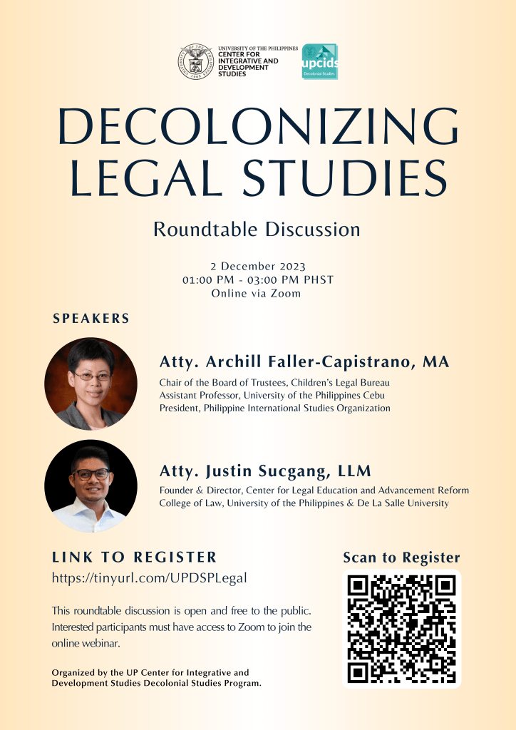 In this upcoming roundtable discussion, the Decolonial Studies Program of the UP Center for Integrative Development Studies aims to explore various ways how to decolonize the knowledge production and practice of law in the Philippines that is attuned to Filipino norms, mores, customs, and culture and to sketch specific ways for the ontology of lawmaking and legal studies to address the contemporary societal needs of Filipinos and counter persisting social cancers and issues.