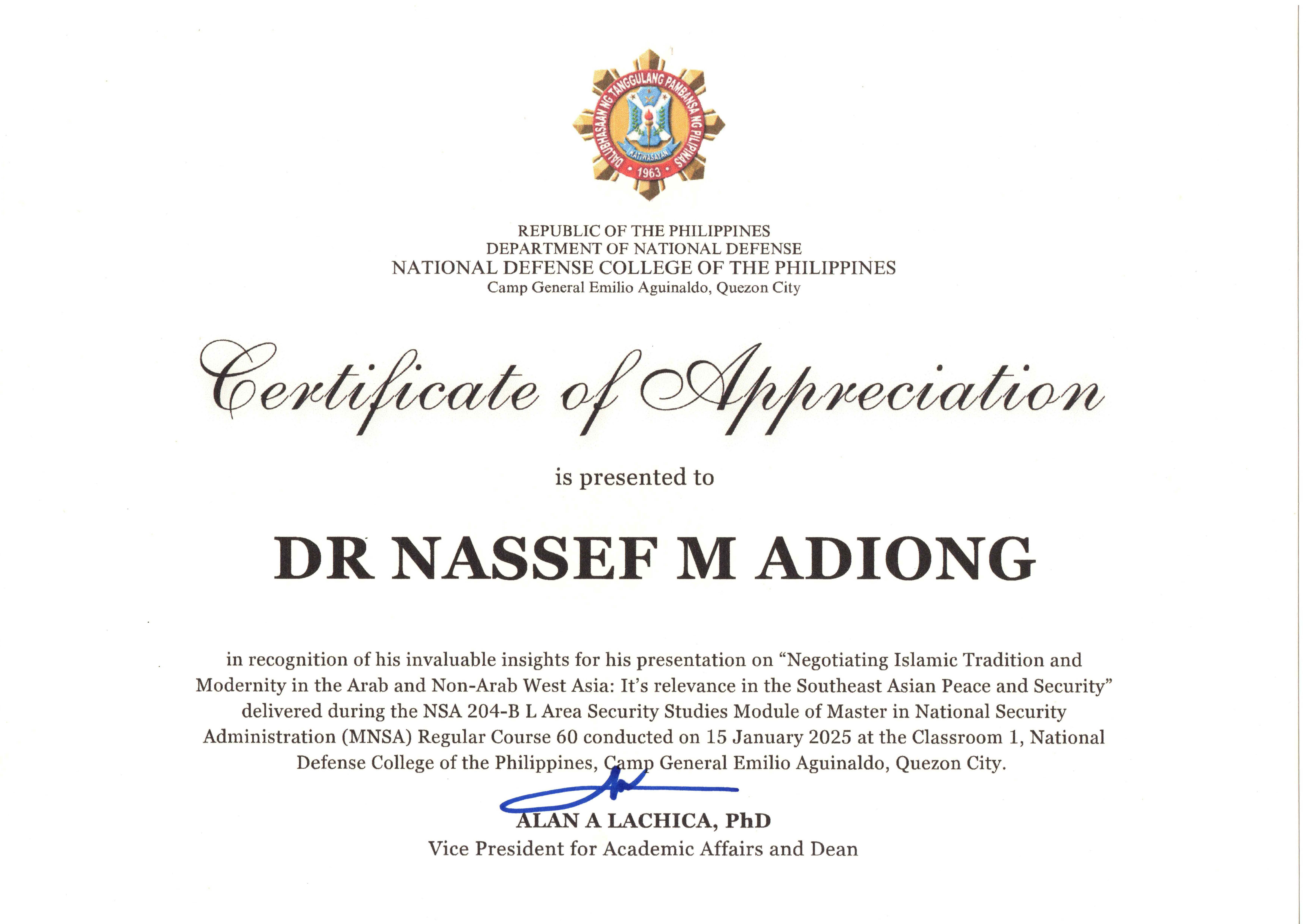 Nassef is the founder of Co-IRIS (International Relations and Islamic Studies Research Cohort), PHISO (Philippine International Studies Organization), DSRN (Decolonial Studies Research Network), and BRLN (Bangsamoro Research and Legal Network). He works on interdisciplinary research between Islam and International Relations and explores the Bangsamoro society as he heads the Policy Research and Legal Services (PRLS) of the Bangsamoro Parliament. Visit https://nassef.info/ for more details. View all posts by Nassef Manabilang Adiong