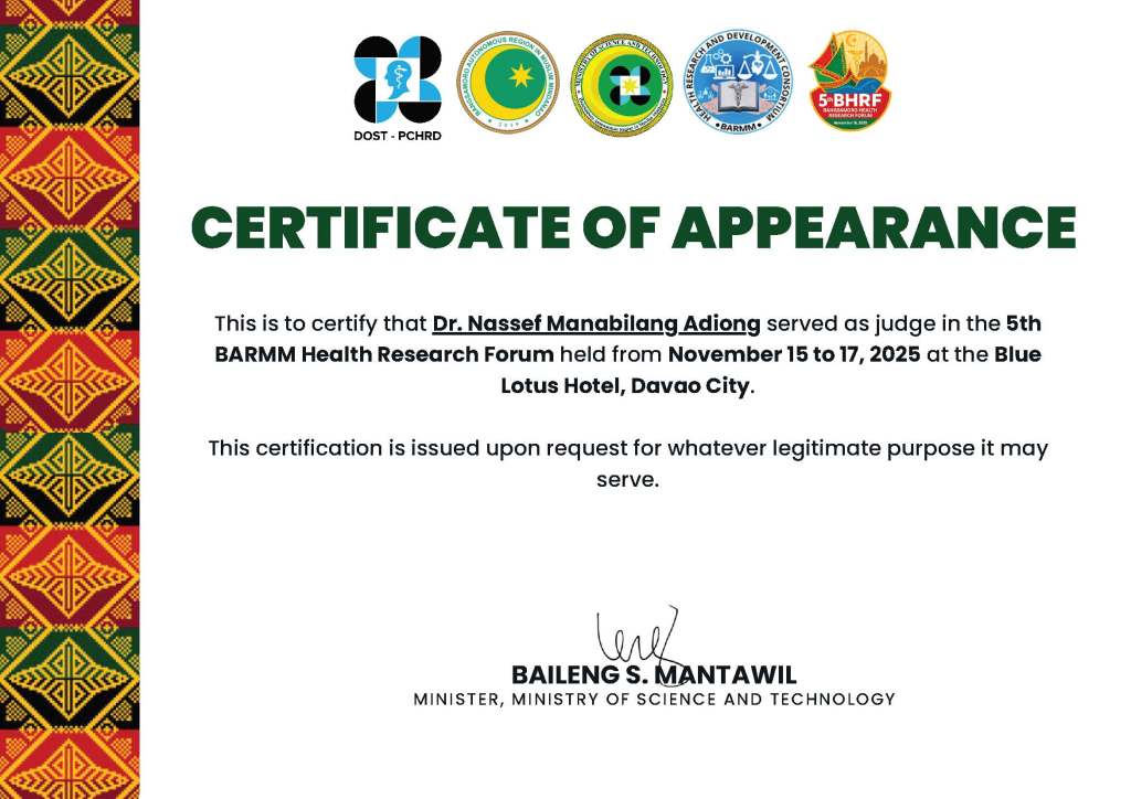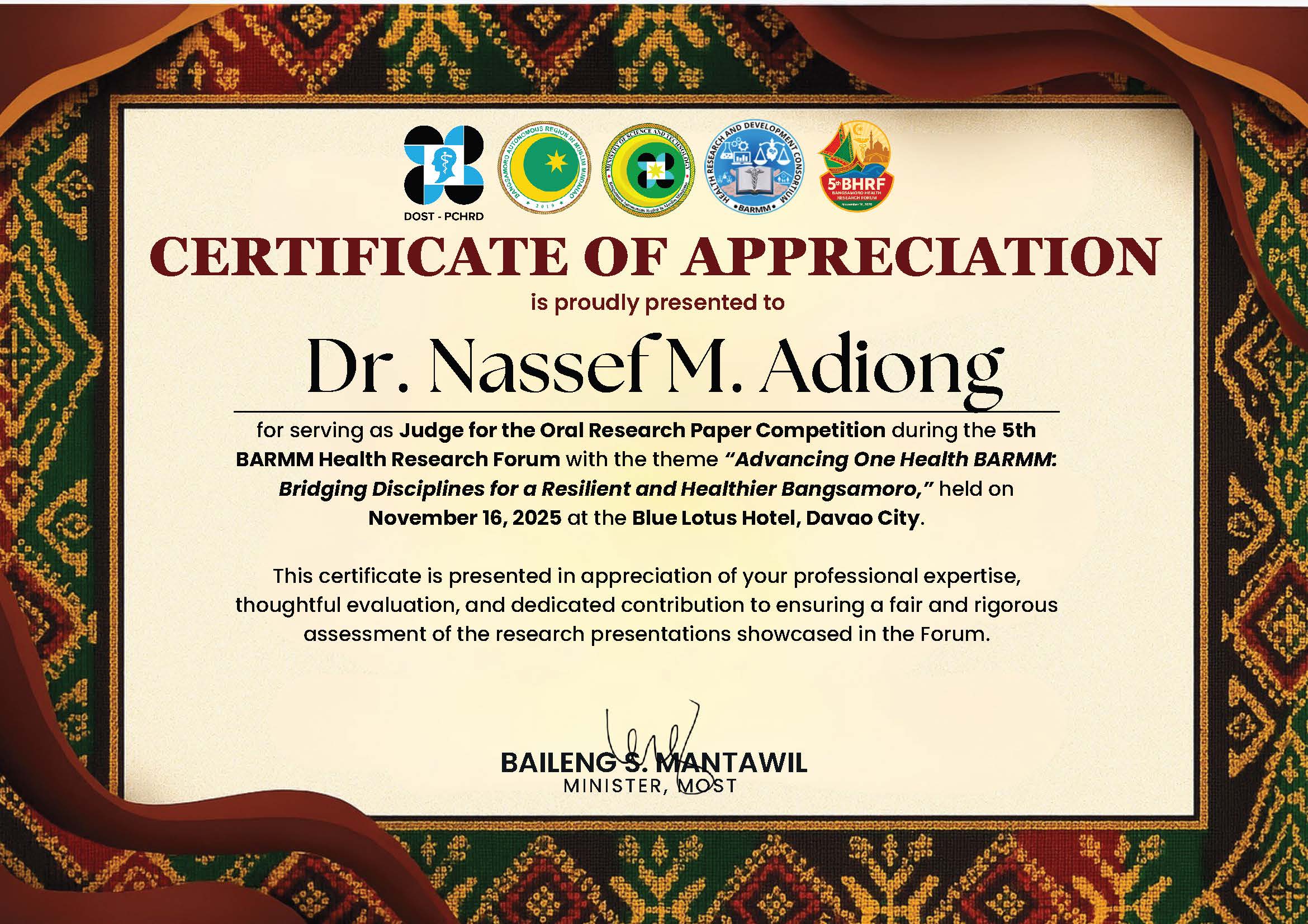 Judge: Oral Research Paper Competition at the 5th BARMM Health Research Forum (organized by BARMM Ministry of Science and Technology held in Davao City on Nov. 16, 2025)