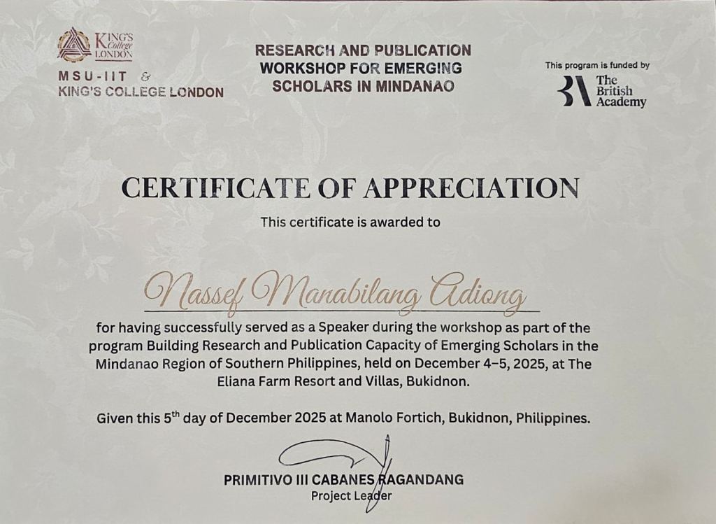 Speaker on “Building Research and Publication Capacity for Emerging Scholars in Mindanao” organized by MSU-IIT and King’s College London held on December 4-5, 2025 in Bukidnon.