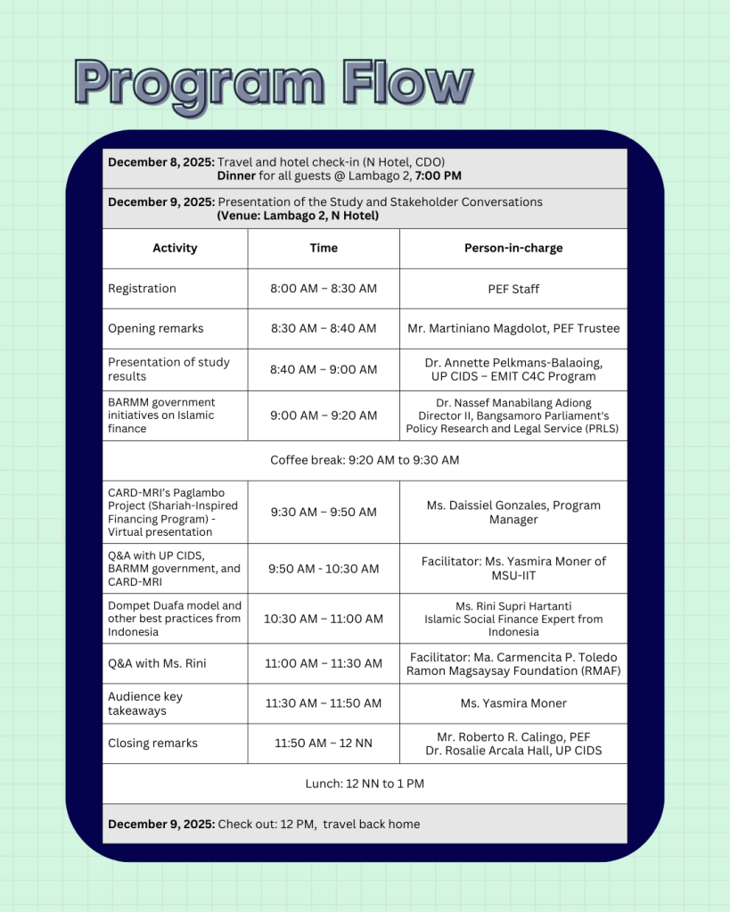 The UP Center for Integrative and Development Studies, through the program EMIT C4C Partnerships Center for Inclusiveness & Competitiveness and with support from the Peace and Equity Foundation, presented the results of its action research on Islamic Finance in the Bangsamoro region in an event held today in the city. Attended by representatives from social enterprises, the BARMM government, the academe, and civil society, the presentation highlighted the current landscape of Islamic finance, CARD MRIโs Paglambo project (Shariah-inspired financing program), and the Bangsamoro governmentโs efforts to further advance this financing mechanism in the region. Islamic Social Finance expert Rini Supri Hartanti from Indonesia also shared the model used by Ramon Magsaysay Awardee Dompet Dhuafa, along with other best practices in Islamic finance implementation from Indonesia.