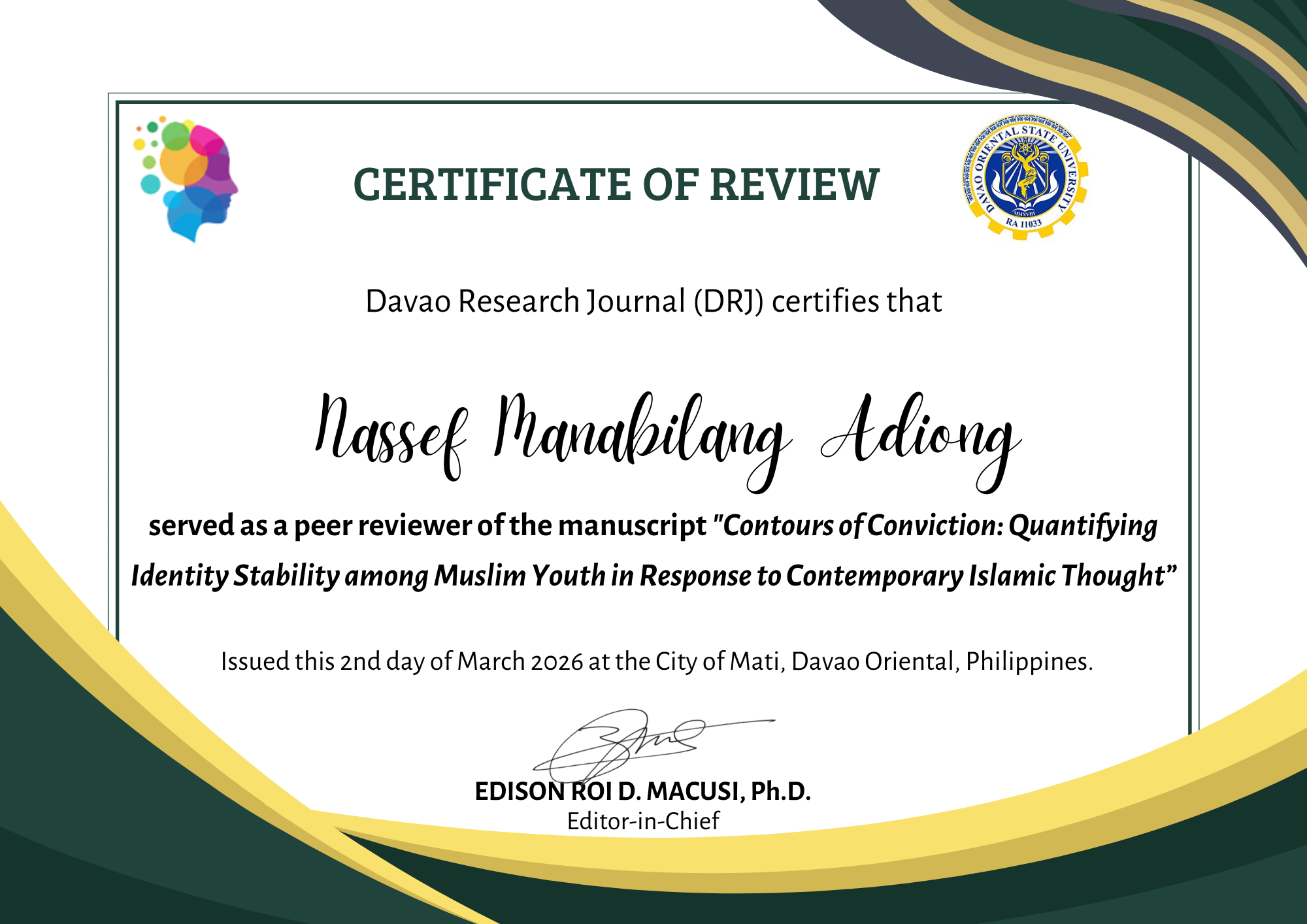 Reviewer to Davao Research Journal of the Davao Oriental State University