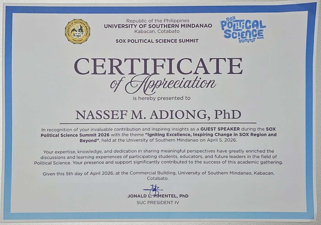 Nassef is the founder of Co-IRIS (International Relations and Islamic Studies Research Cohort), PHISO (Philippine International Studies Organization), DSRN (Decolonial Studies Research Network), and BRLN (Bangsamoro Research and Legal Network). He works on interdisciplinary research between Islam and International Relations and explores the Bangsamoro society as he heads the Policy Research and Legal Services (PRLS) of the Bangsamoro Parliament. Visit https://nassef.info/ for more details. View all posts by Nassef Manabilang Adiong
