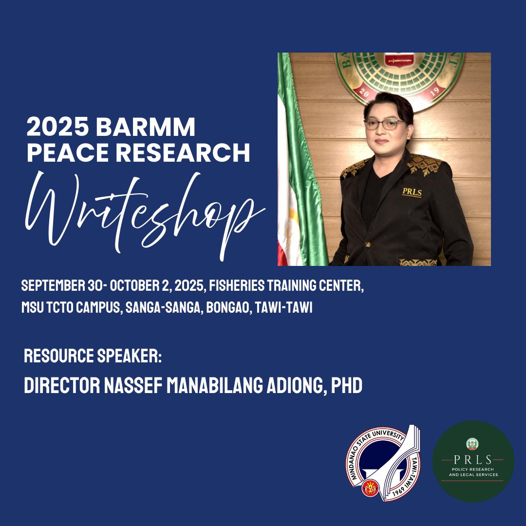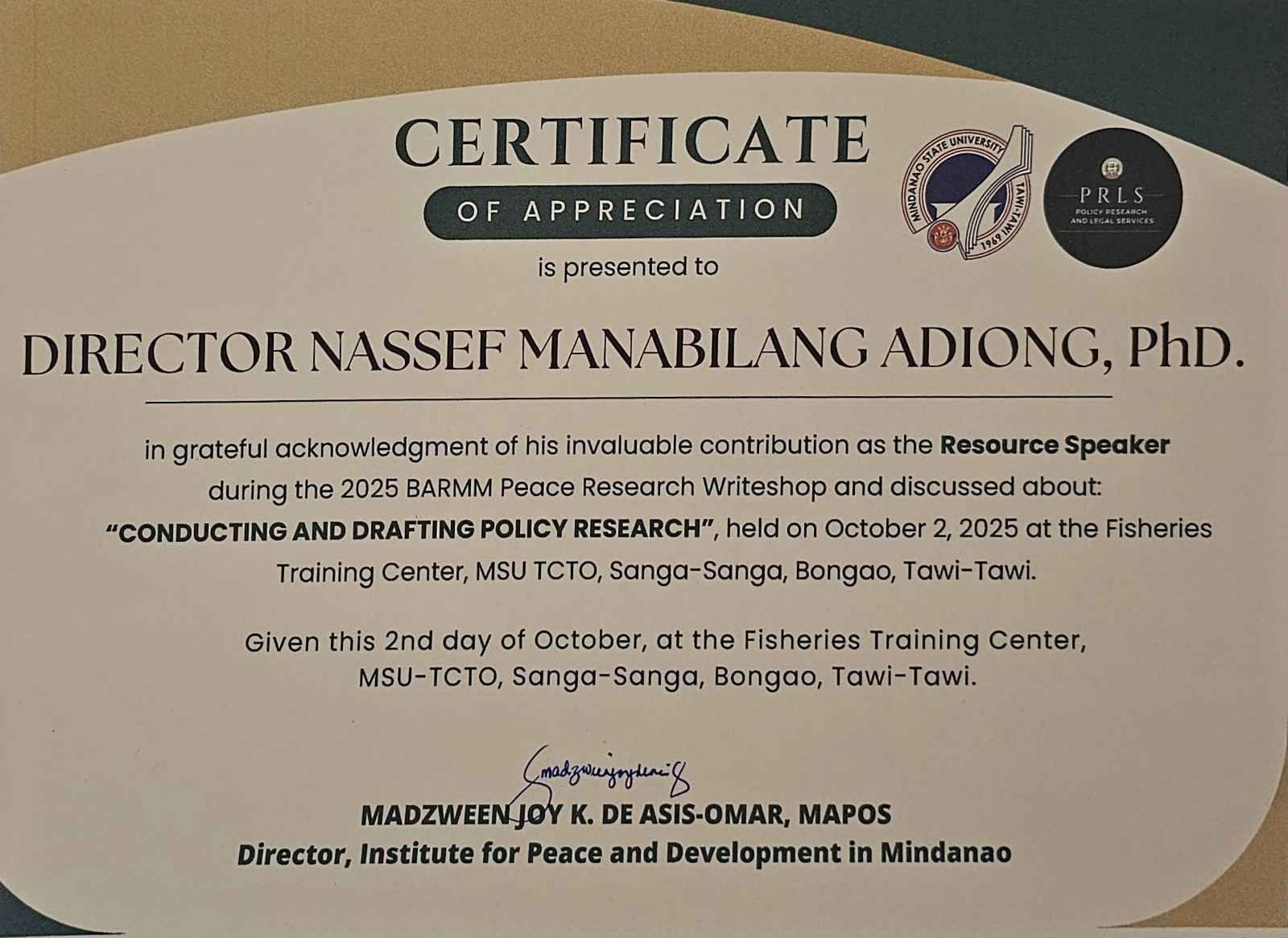 Resource speaker at the BARMM Peace Research Writeshop organized by MSU Tawi-Tawi’s Institute for Peace and Development in Mindanao held on Sept. 29-Oct. 02 at MSU Tawi-Tawi.