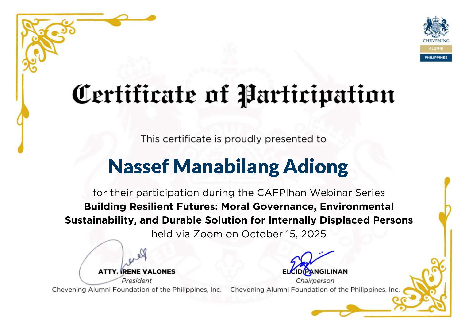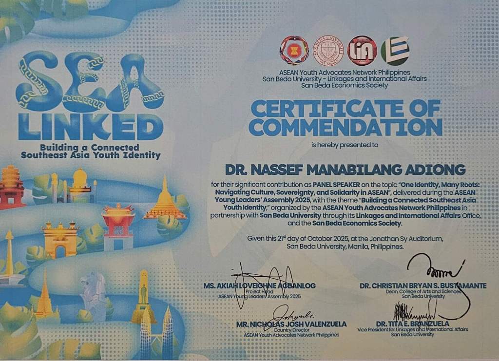 Nassef is the founder of PHISO (Philippine International Studies Organization), BRLN (Bangsamoro Research and Legal Network), DSRN (Decolonial Studies Research Network), and Co-IRIS (International Relations and Islamic Studies Research Cohort). He researches policy issues affecting the Bangsamoro society and explores decolonial knowledge sources of the global south as well as interdisciplinary study between Islam and International Relations.