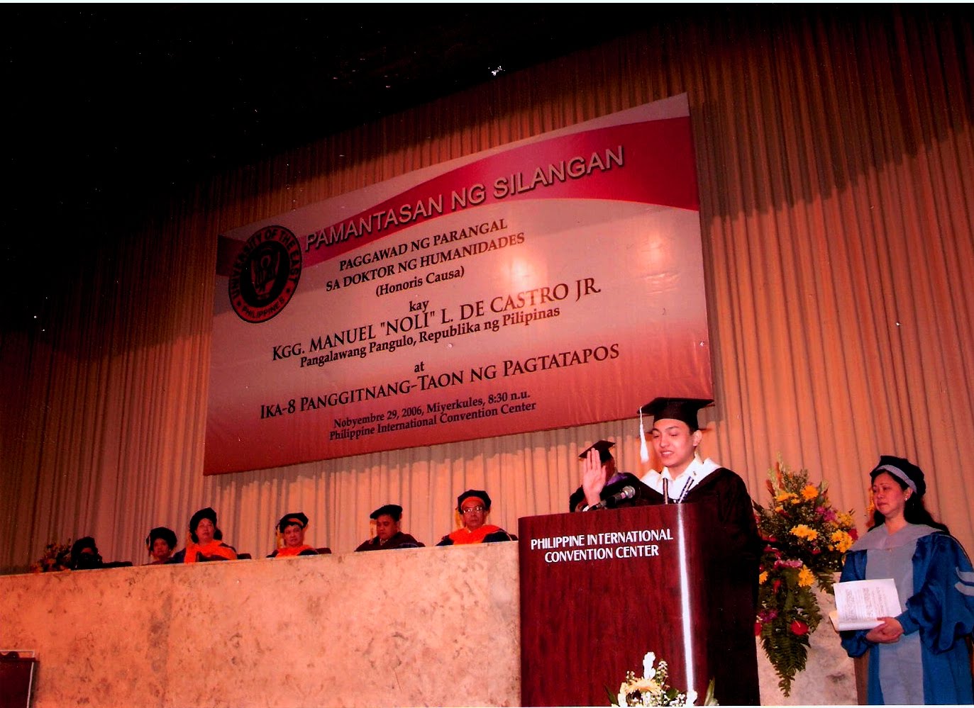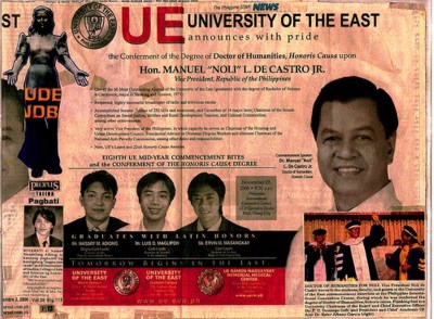 Vice President Manuel “Noli” L. de Castro Jr. will be conferred the degree of Doctor of Humanities, Honoris Causa, by the University of the East (UE) during the school’s 8th Midyear Commencement Rites today, 8:30 a.m., at the Philippine International Convention.