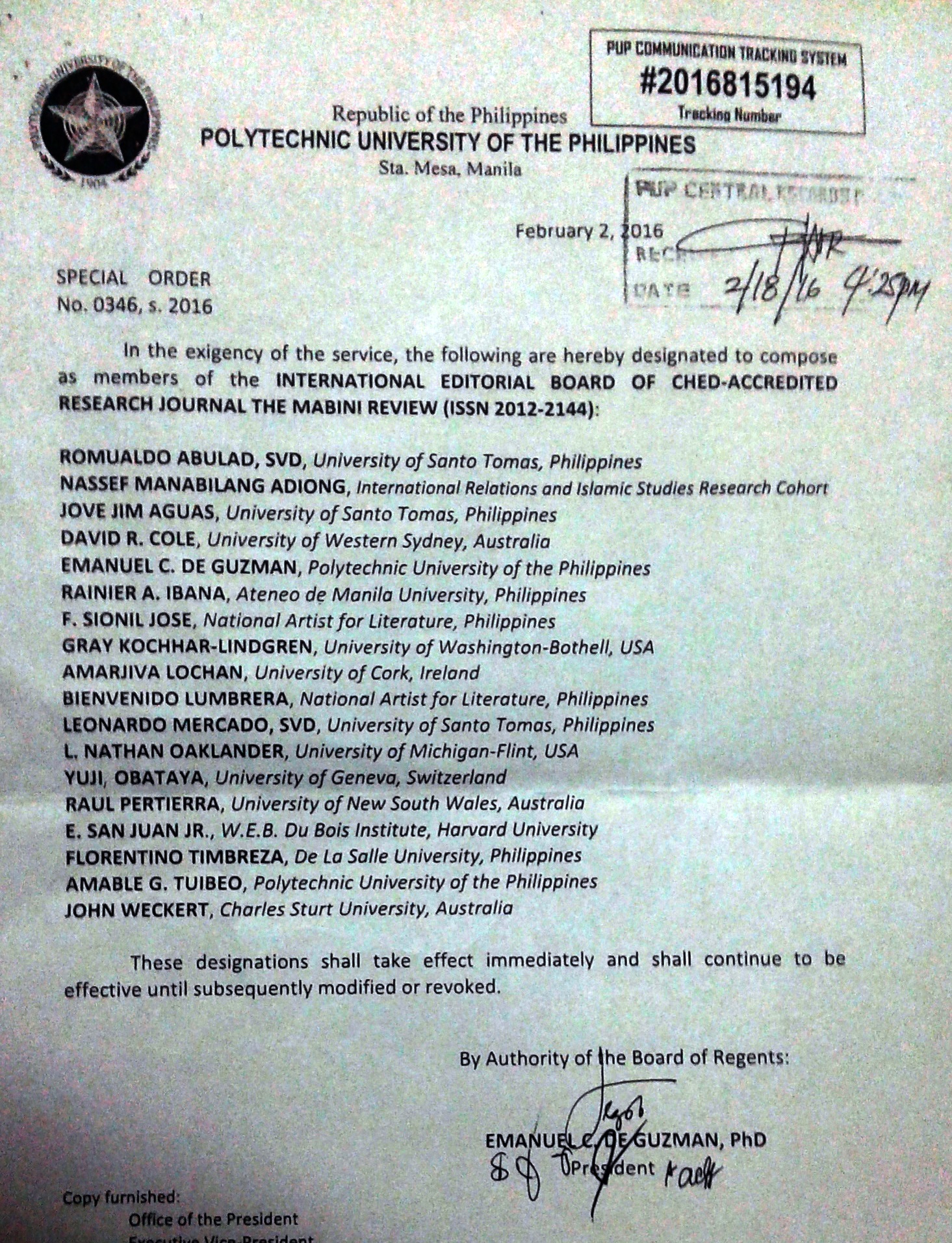 (2016-Present) International Editorial Board Member of CHED Accredited Research Journal, The Mabini Review (ISSN 2012-2144)