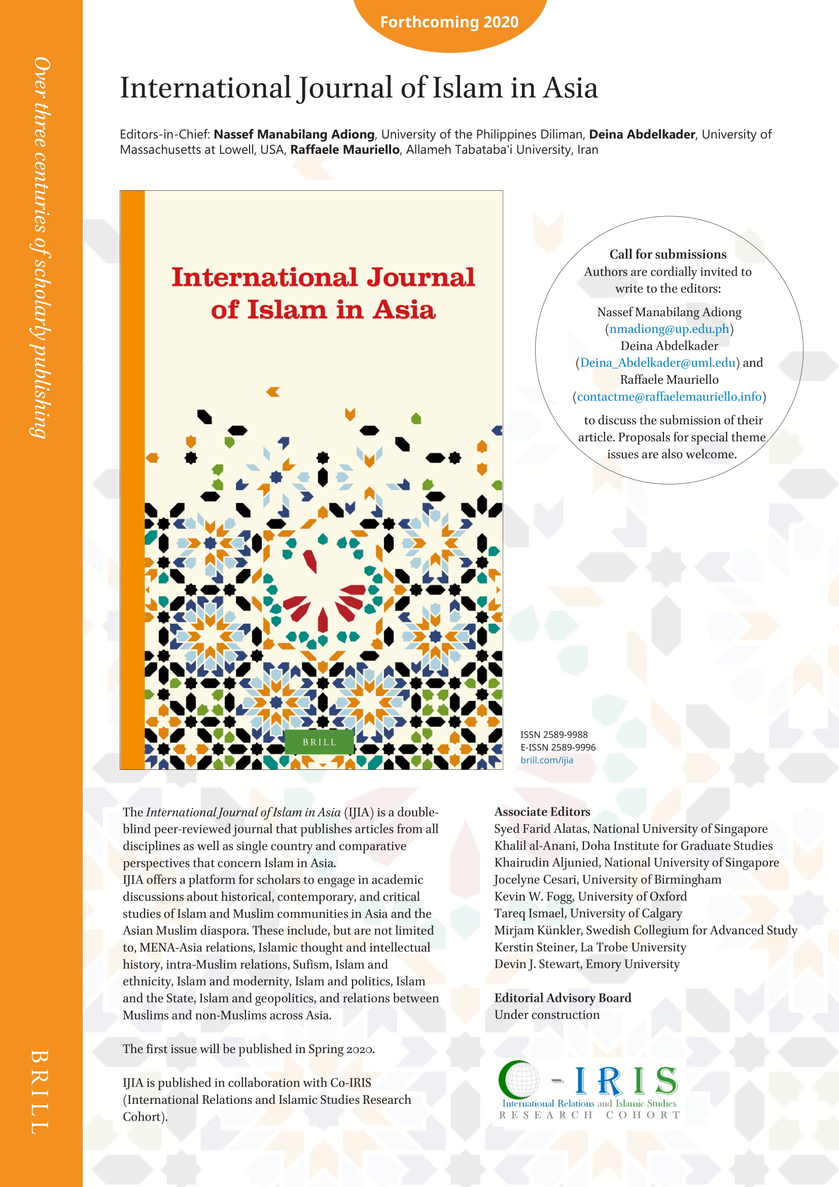 The International Journal of Islam in Asia (IJIA) is a double-blind peer-reviewed journal that publishes articles from all disciplines as well as single country and comparative perspectives that concern Islam in Asia. IJIA offers a platform for scholars to engage in academic discussions about historical, contemporary, and critical studies of Islam and Muslim communities in Asia and the Asian Muslim diaspora. These include, but are not limited to, MENA-Asia relations, Islamic thought and intellectual history, intra-Muslim relations, Sufism, Islam and ethnicity, Islam and modernity, Islam and politics, Islam and the State, Islam and geopolitics, and relations between Muslims and non-Muslims across Asia.