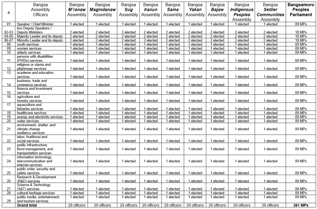 The elected sectoral service representatives shall automatically take the leadership role of their respective ministries, agencies and offices (MOAs) within a particular Bangsa Assembly, thus public services are devolved and trickle down to their own people. It is up to the particular Bangsa Assembly’s preference if they wanted to add other types of services in the budget appropriation in creating new public service-oriented MOAs. For now, each Bangsa Assembly shall have a total of 29 elected Assembly Officers which shall form part the total number of Members of the Bangsamoro Peoples Parliament at the regional level, i.e., a total of 261 MPs. The computation is shown below: